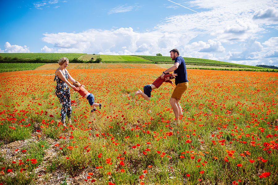 Elodie avait reçu un bon cadeau à l’occasion des fêtes de fin d’année. On a attendu que l’été arrive pour pouvoir enfin la réaliser! Elle a prévu des tenues aux couleurs chaudes pour les garçons et flori pour elle. Nous avons décidé de faire les photos en ville mais sur notre route ont a découvert ce magnifique champs de coquelicots, on a pas pu s’empêcher de s’arrêter quelques instants, et nous avions bien raison car le rendu est très jolie !